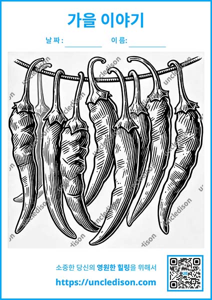 - 붉게 말린 고추 처마 끝에 주렁주렁 매달린 붉은 고추가 가을 준비의 분주함을 보여줍니다.