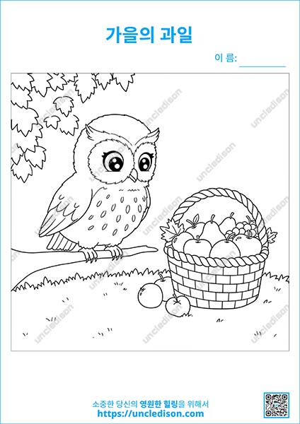 - 부엉이의 과일 바구니: 부엉이가 과일들을 지켜보고 있어요. 바구니에 있는 과일들을 하나씩 세어보는 것도 좋아요.
