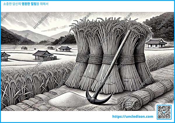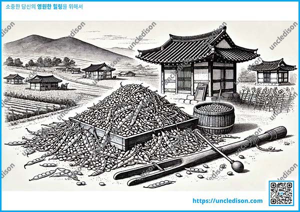 마지막으로 콩을 수확하는 장면이 있어요. 도리깨로 콩을 터는 모습을 보니, 할아버지께서 콩을 터시던 모습이 떠오르네요. 콩 터는 소리가 둔탁둔탁 들리는 것 같아요. 요즘엔 이런 광경을 보기 힘들어서 더 특별해요.