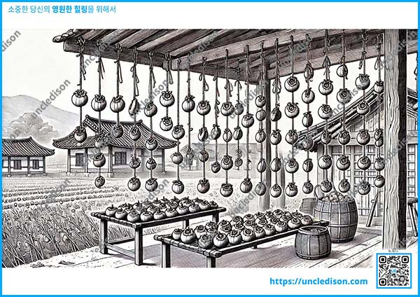 처마 밑에 주렁주렁 매달린 곶감들, 정말 가을다운 풍경이죠? 할아버지께서 정성스레 감을 깎아 처마에 매다시던 모습이 눈에 선해요. 나중에 말린 곶감을 먹을 때면 그 달콤함에 가을 내내 기다린 보람을 느꼈죠.