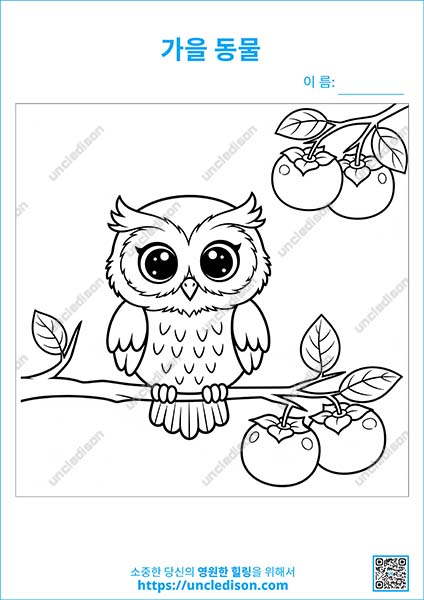 🦉 일곱 번째 도안에는 탐스러운 감이 열린 나뭇가지에 앉아 있는 귀여운 부엉이가 있어요. 부엉이의 지혜로운 눈을 색칠하며 가을을 느껴보세요.
