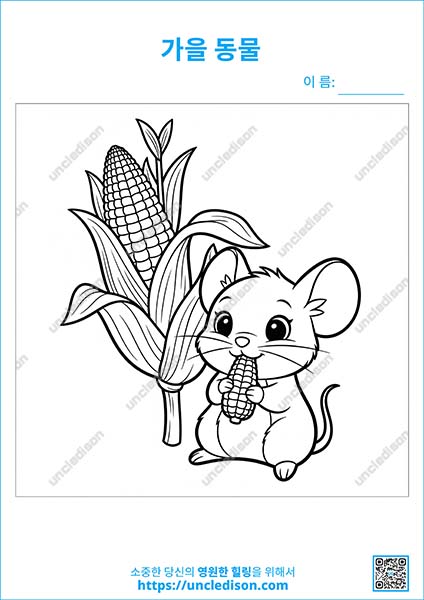 🐭 여덟 번째 도안은 작은 생쥐가 옥수수 알갱이를 맛있게 먹고 있는 모습이에요. 옥수수를 보면서 고소한 냄새를 상상해 볼 수 있겠죠?