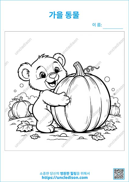 🐻 두 번째 도안은 커다란 호박을 꼭 끌어안고 있는 사랑스러운 아기 곰이랍니다. 곰돌이가 좋아하는 호박에게 어떤 색을 입힐지 함께 이야기 나눠 보세요.