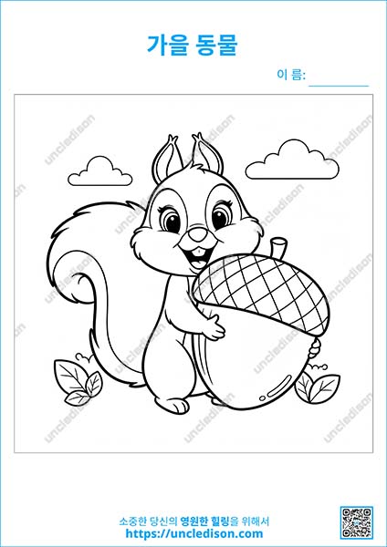 🐿️ 첫 번째 도안에는 귀여운 다람쥐가 커다란 도토리를 꼭 안고 있어요. 다람쥐에게 어떤 멋진 색깔 옷을 입혀줄지 상상하며 즐겁게 색칠해 보세요!