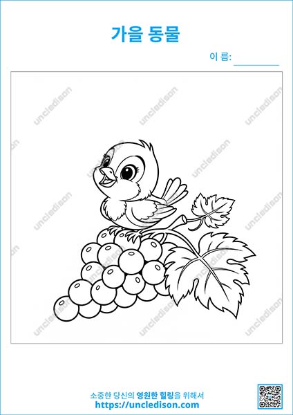 🍇 다섯 번째 도안은 탐스러운 포도송이 위에 앉아 행복하게 웃고 있는 작은 새예요. 새와 포도에게 어떤 색깔이 가장 잘 어울릴지 아이와 함께 상상해 보세요.