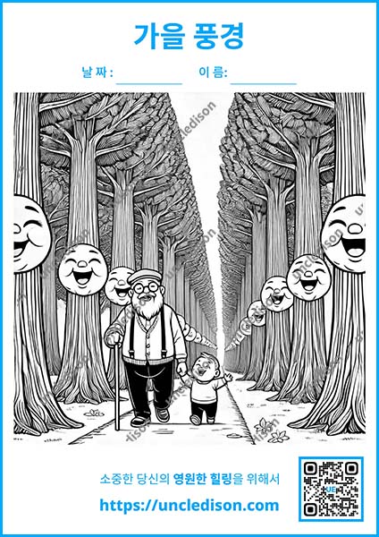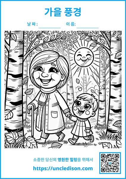 하얀 자작나무 사이로 따스한 가을 햇살이 비치는 모습을 상상해보세요. 노란 낙엽이 수북이 쌓인 길을 할아버지와 손녀가 걸어가요. "할아버지, 저기 다람쥐 봤어요?" 라며 즐겁게 이야기 나누는 모습이 그려지네요.