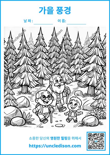 푸른 소나무가 가득한 산책길을 걸어본 적 있나요? 할아버지 손을 잡고 상쾌한 공기를 마시며 걸어보세요. 솔방울도 주워보고, 멀리 보이는 단풍 든 나무들도 구경하며 가을 산의 정취를 만끽해보는 거예요.
