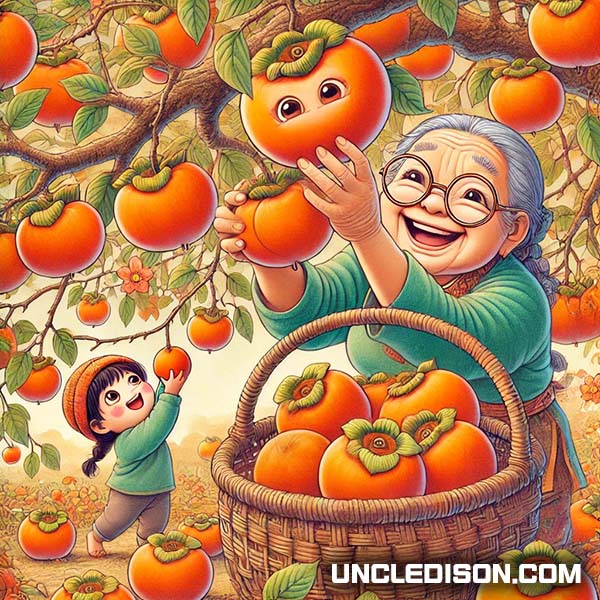 가을하면 빼놓을 수 없는 게 바로 감이에요. 주황빛 감이 주렁주렁 매달린 나무 아래서 할머니가 감을 따고 있어요. "얘야, 이리 와서 곶감 만드는 법 배워볼래?" 하고 부르시네요. 할머니와 함께 감을 깎아 처마 밑에 줄줄이 매다는 모습, 정겨워 보이지 않나요?