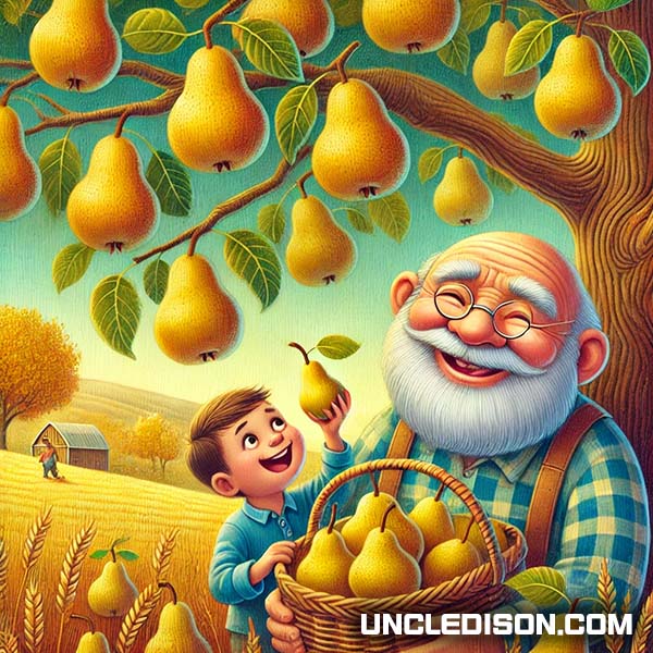 노랗게 익은 벼 사이로 배나무 한 그루가 서 있어요. 탐스럽게 익은 배가 주렁주렁 열렸네요. 할아버지가 손주에게 배를 따는 법을 가르쳐주고 계세요. "이렇게 살살 비틀어서 따는 거야." 할아버지의 말씀에 귀