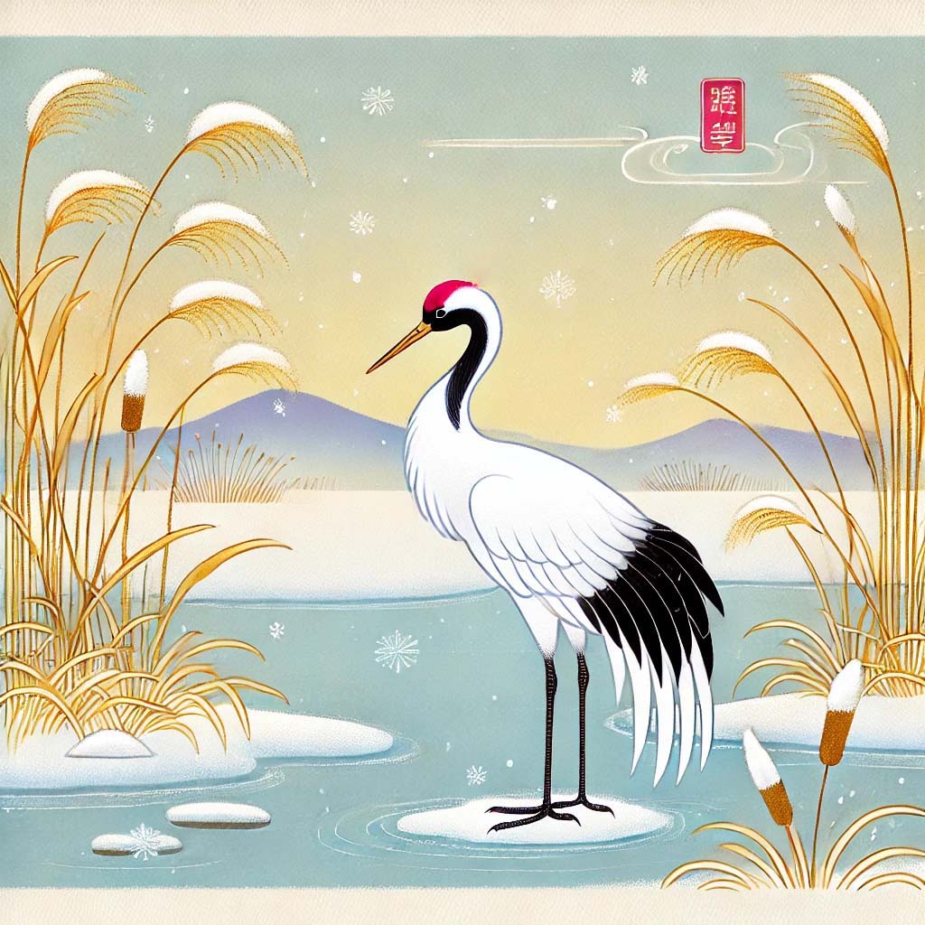 "얼음 위의 두루미" 🦢는 마치 시간이 멈춘 듯한 고요함 속에서 우아한 자태를 뽐내고 있어요. 겨울 아침의 은은한 빛이 두루미의 하얀 깃털을 더욱 빛나게 만들어주네요.