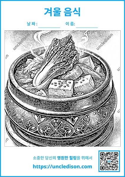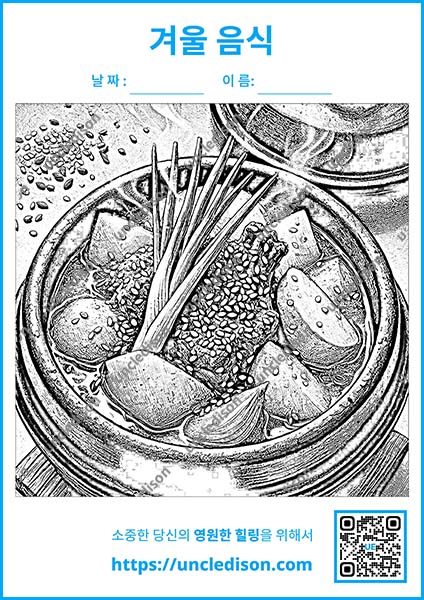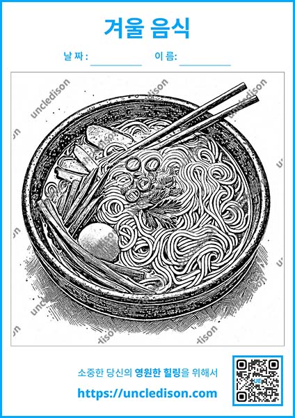 오늘은 제가 준비한 겨울 음식 색칠도안으로 즐거운 시간 보내볼 거예요! 하얀 도화지에 여러분의 예쁜 색으로 채워주시면 됩니다. 그럼 어떤 음식들이 있는지 하나씩 살펴볼까요? 🎨