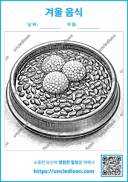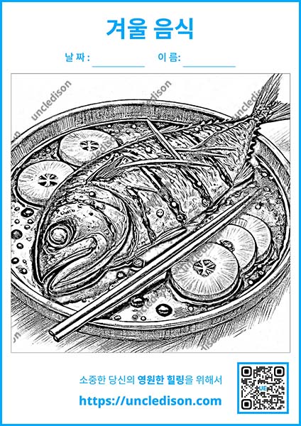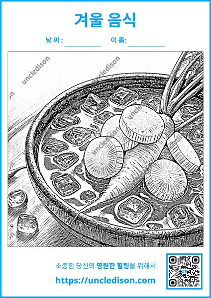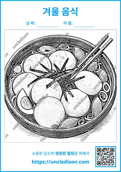 자, 이제 여러분의 차례예요! 우리나라의 맛있는 겨울 음식들을 예쁘게 색칠해보세요. 여러분만의 감각으로 더 맛있어 보이게 표현하면 좋겠어요! 🎨 💫