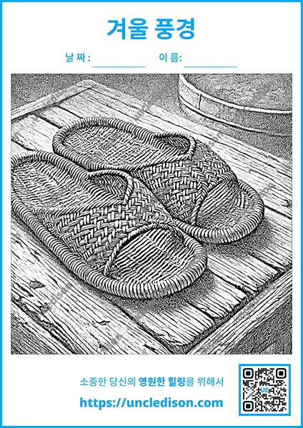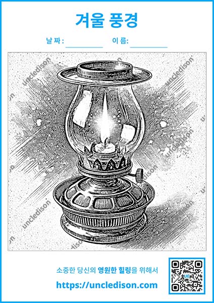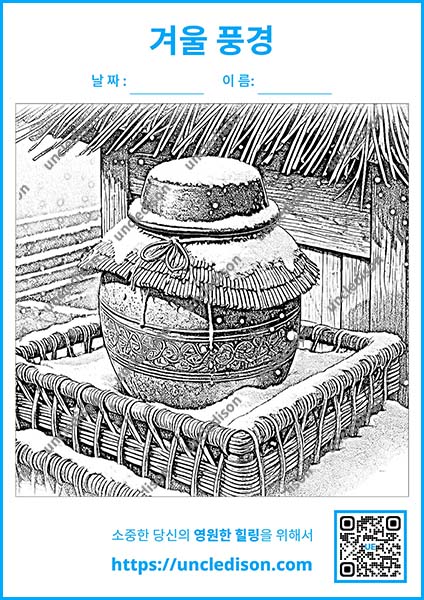 이 도안으로 색칠하면서 우리의 정겨운 옛 겨울 풍경도 추억하고, 나만의 따뜻한 겨울 이야기도 만들어보세요! 💕 빨간색으로 칠할까요, 파란색으로 칠할까요? 아니면 우리의 추억처럼 따뜻한 갈색 계열로 채워볼까요?