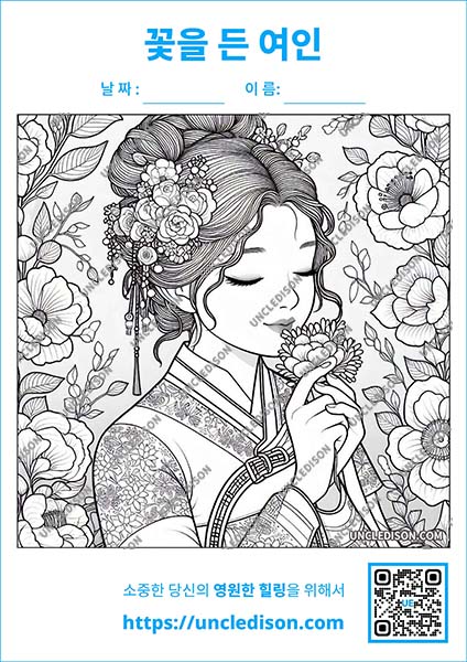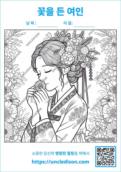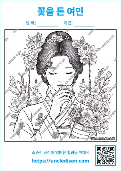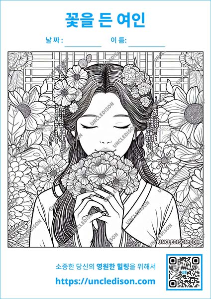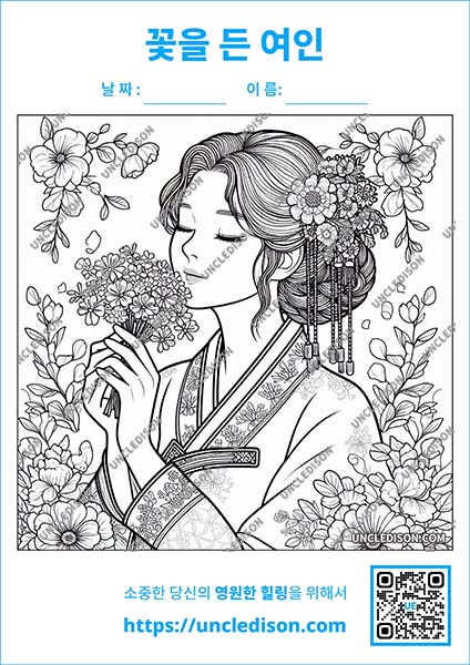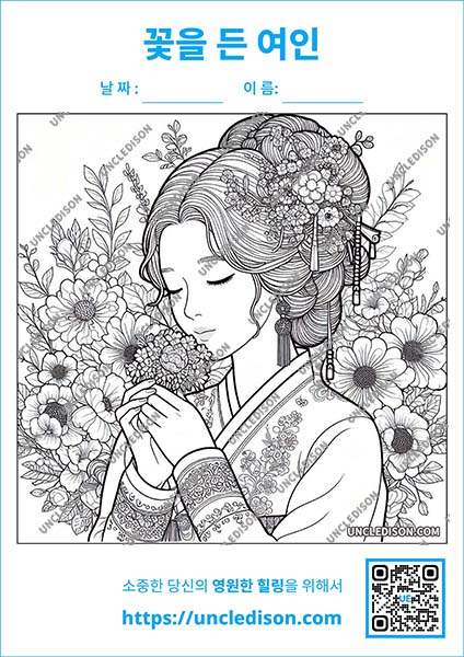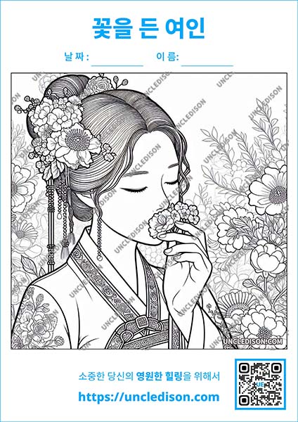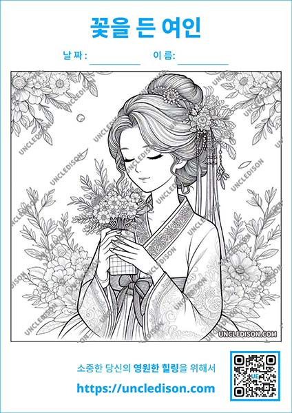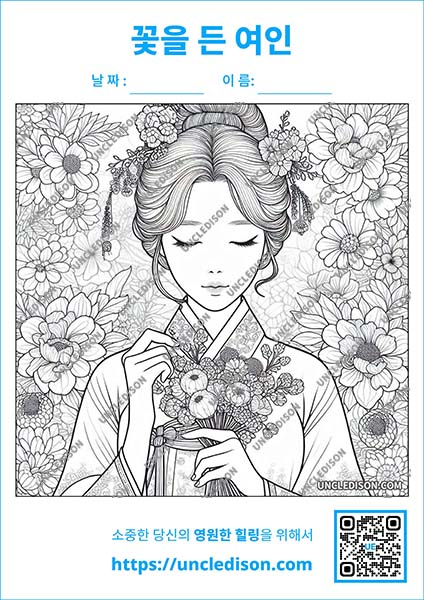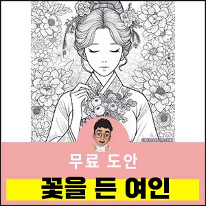 한국 전통 민화 스타일로 꽃을 들고 있는 단아한 여인을 그린 색칠 도안을 준비했습니다. 이 도안은 화려한 꽃들로 둘러싸인 여인의 우아한 모습을 민화의 특징을 살려 제작한 것으로, 전통 예술의 아름다움과 현대적인 감각이 조화를 이루고 있습니다.
