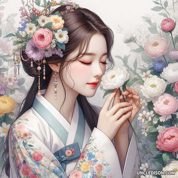 민화로 그린 꽃을 든 여인 여성 한복 이미지 일러스트 무료 다운로드 도안