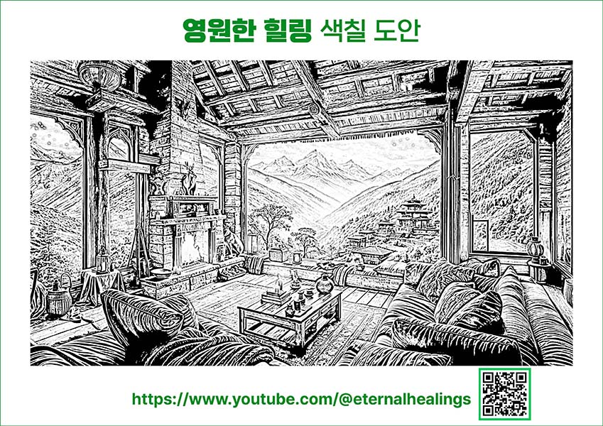 집 안에서는 따뜻한 차가 놓인 탁자가 중심에 있으며, 그 앞의 벽난로에는 불이 환하게 타오르고 있습니다. 벽난로의 불빛은 방 안을 따스하게 밝히며, 불꽃의 흔들림은 마음을 안정시키는 리듬을 만들어냅니다. 전통 네팔 카펫이 깔린 거실 바닥은 이국적인 분위기를 더하며, 이곳에서의 시간이 얼마나 평화로운지를 상기시킵니다.