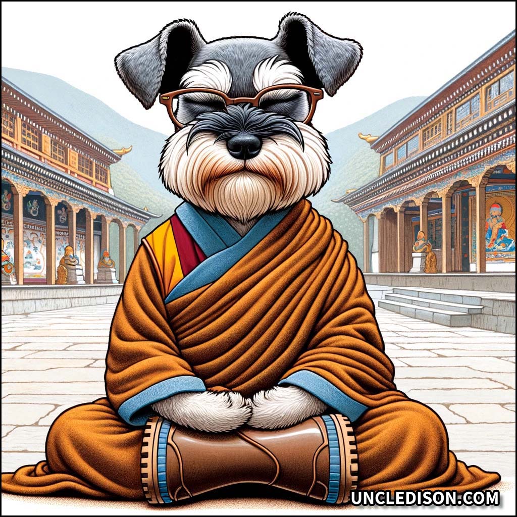슈나우저는 승려 옷을 입고 고무신을 신은 채, 침묵 속에서 명상을 하고 있습니다. 조용한 절의 한 켠에서 깊은 사색에 잠긴 모습이 인상적입니다.