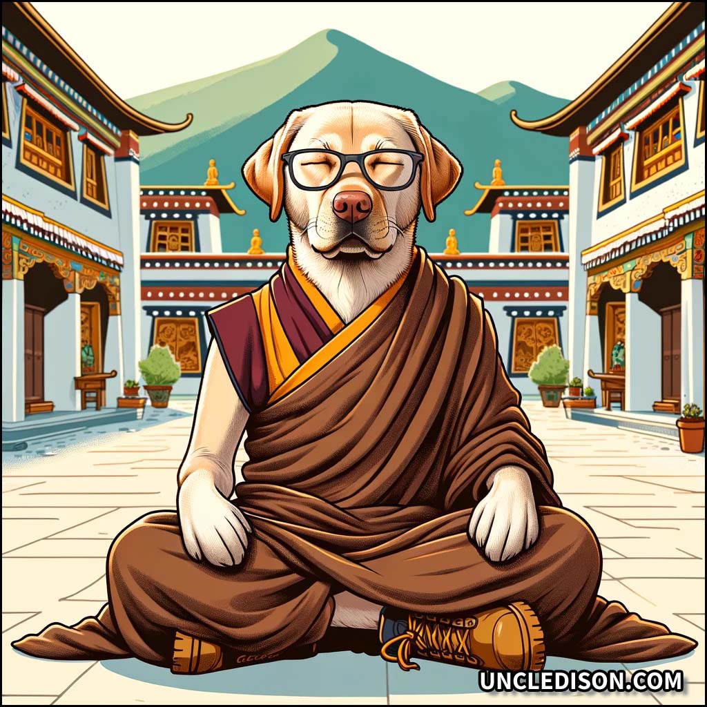골든 리트리버는 승려 옷을 입고 고무신을 신은 채, 양반다리로 앉아 명상을 하고 있습니다. 부드러운 미소를 지으며 마음의 평화를 찾고 있는 모습이 사랑스럽습니다.