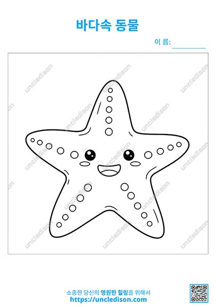 🌟 두 번째 그림은 활짝 웃는 불가사리 친구예요. 불가사리는 팔이 몇 개인지 세어보고, 어떤 색깔이 가장 잘 어울릴지 아이와 함께 이야기 나눠보세요.