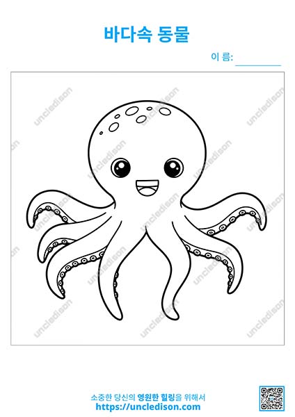 🐙 네 번째 그림은 행복한 미소를 짓고 있는 문어예요. 문어의 많은 다리를 어떤 색깔로 칠해줄지 아이의 창의력에 맡겨주세요.