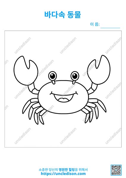 🦀 세 번째 그림에는 장난기 가득한 미소를 띠고 있는 귀여운 게가 옆으로 움직이고 있어요. 게를 칠하면서 게가 집게발로 무엇을 할 수 있을지 상상해 보세요.