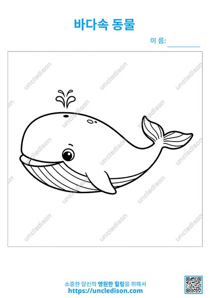 🐳 마지막 열 번째 그림은 호기심 가득한 미소를 짓는 고래예요. 고래는 얼마나 큰지, 어떤 소리를 낼지 아이와 함께 이야기하며 바닷속 거인을 색칠해 보세요.