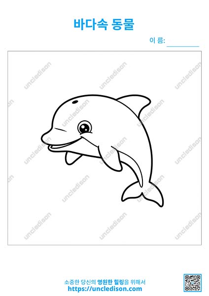 ✨ 첫 번째 그림에는 커다란 미소를 짓고 있는 친근한 돌고래가 헤엄치고 있어요. 돌고래가 어떤 멋진 재주를 부릴 수 있을지 상상하며 예쁘게 색칠해 보세요.