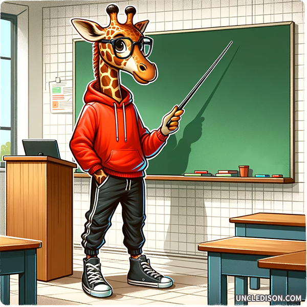 첫 번째로 기린이 빨간 후드티와 검은색 조거 팬츠, 흰색 컨버스 스니커즈를 신고 안경을 쓴 채 교실에서 발표를 하고 있습니다. 긴 목을 휘감으며 친구들의 시선을 끌고 있는 기린의 모습이 인상적입니다. 다음으로는 코끼리가 파란색 폴로 셔츠와 카키색 반바지, 검은색 아디다스 운동화를 신고 점심 식사를 하고 있습니다. 큰 귀를 살랑거리며 친구들과 대화를 나누는 모습이 재미있습니다. 체육 시간에는 사자가 회색 스웨트셔츠와 검은색 러닝 쇼츠, 빨간색 나이키 운동화를 신고 농구를 하고 있는데, 열정적인 사자의 모습이 돋보입니다.