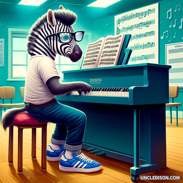 미술 시간에는 치타가 녹색 티셔츠와 청바지, 노란색 반스 스니커즈를 신고 그림을 그리고 있습니다. 빠른 손놀림으로 생생한 그림을 완성하는 치타의 모습이 흥미롭습니다. 과학 시간에는 코뿔소가 회색 후드티와 검은색 반바지, 회색 뉴발란스 운동화를 신고 실험을 진행하고 있는데, 실험에 집중하는 모습이 인상적입니다. 음악 시간에는 얼룩말이 하얀색 티셔츠와 진청색 청바지, 파란색 아디다스 운동화를 신고 피아노를 연주하고 있습니다. 리듬에 맞춰 움직이는 얼룩말의 모습이 눈에 띕니다.