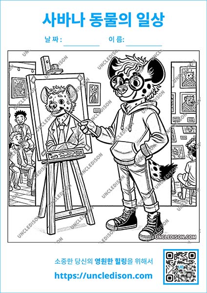 꼼꼼하게 계산하는 가젤의 모습이 인상적입니다. 마지막으로 하이에나는 파란색 후드티와 회색 청바지, 검은색 컨버스 하이탑을 신고 안경을 쓴 채 미술 작품을 전시하고 있습니다. 작품 앞에서 웃으며 친구들과 이야기를 나누는 하이에나의 모습이 흥미롭습니다.