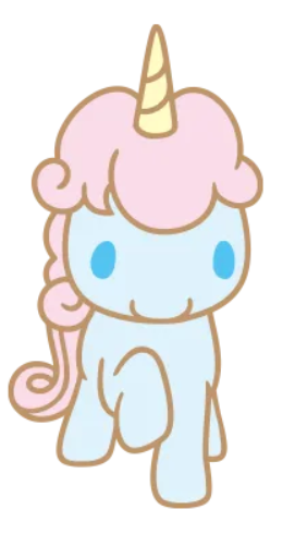 뿔은 노란색, 갈기는 분홍색, 몸통은 하늘색, 눈은 시나몬과 포롱처럼 파란 색인 유니콘.