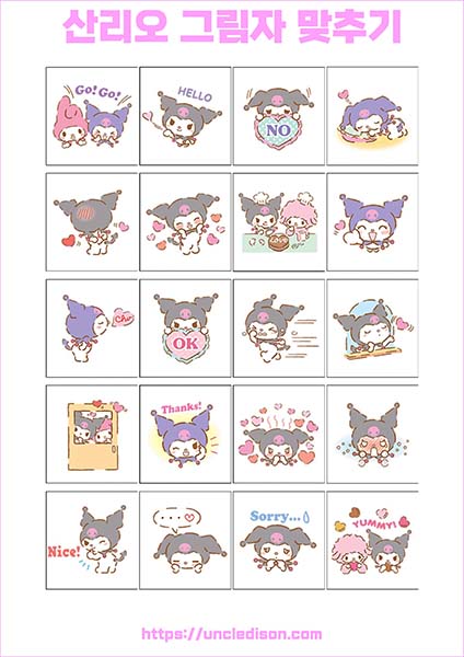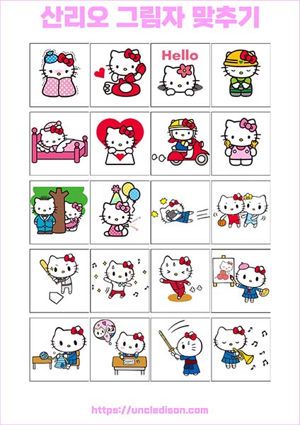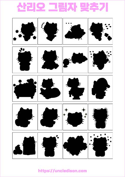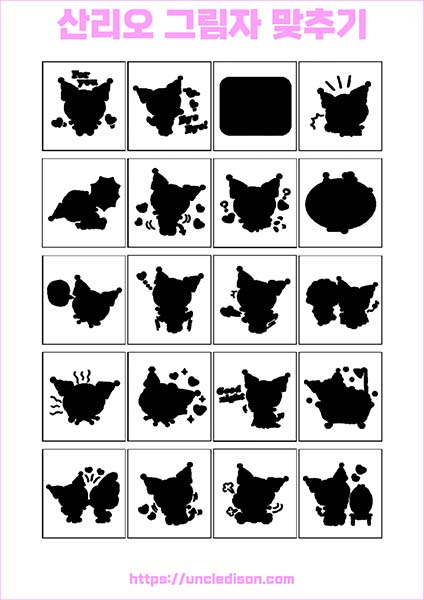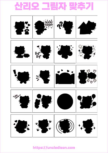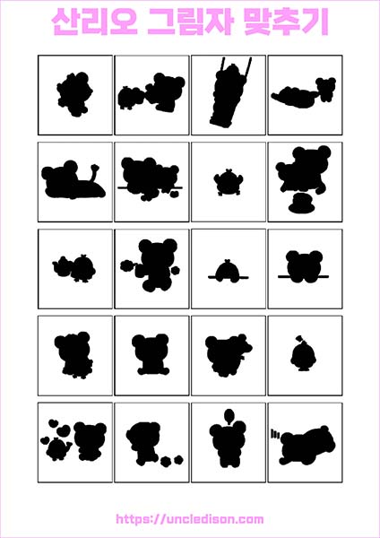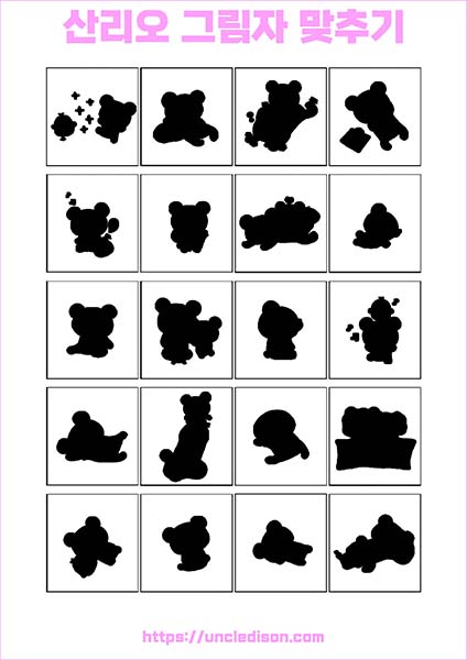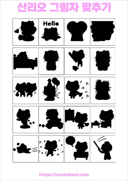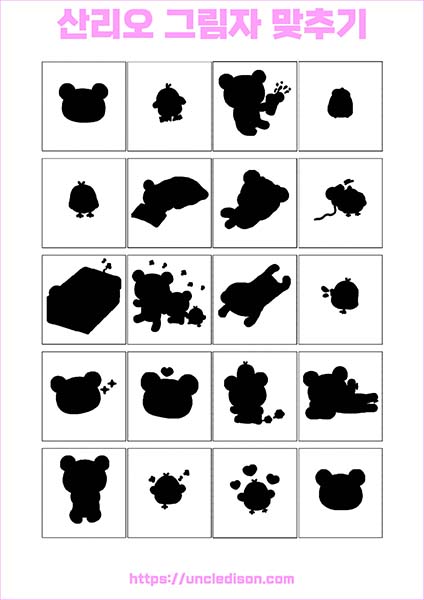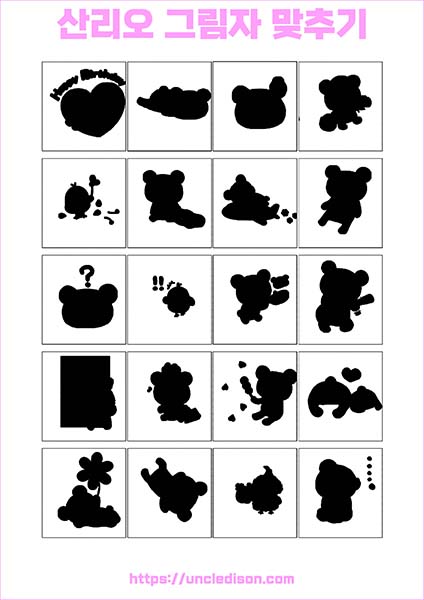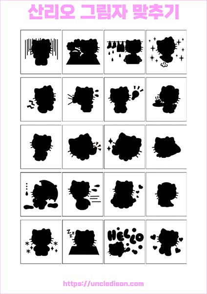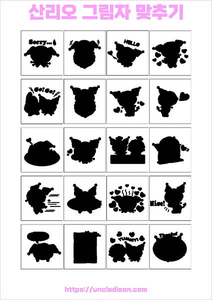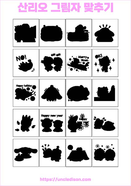 산리오 캐릭터 시나모롤 마이멜로디 쿠로미 케로피 헬로키티 폼폼푸린 리락쿠마 그림자 맞추기 퍼즐 게임 도안 놀이 프린트 무료다운 어르신 노인 유아 인지프로그램 치매예방