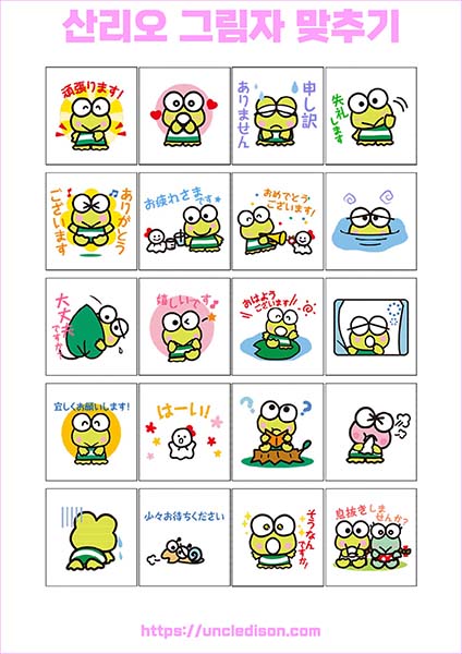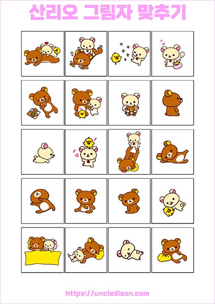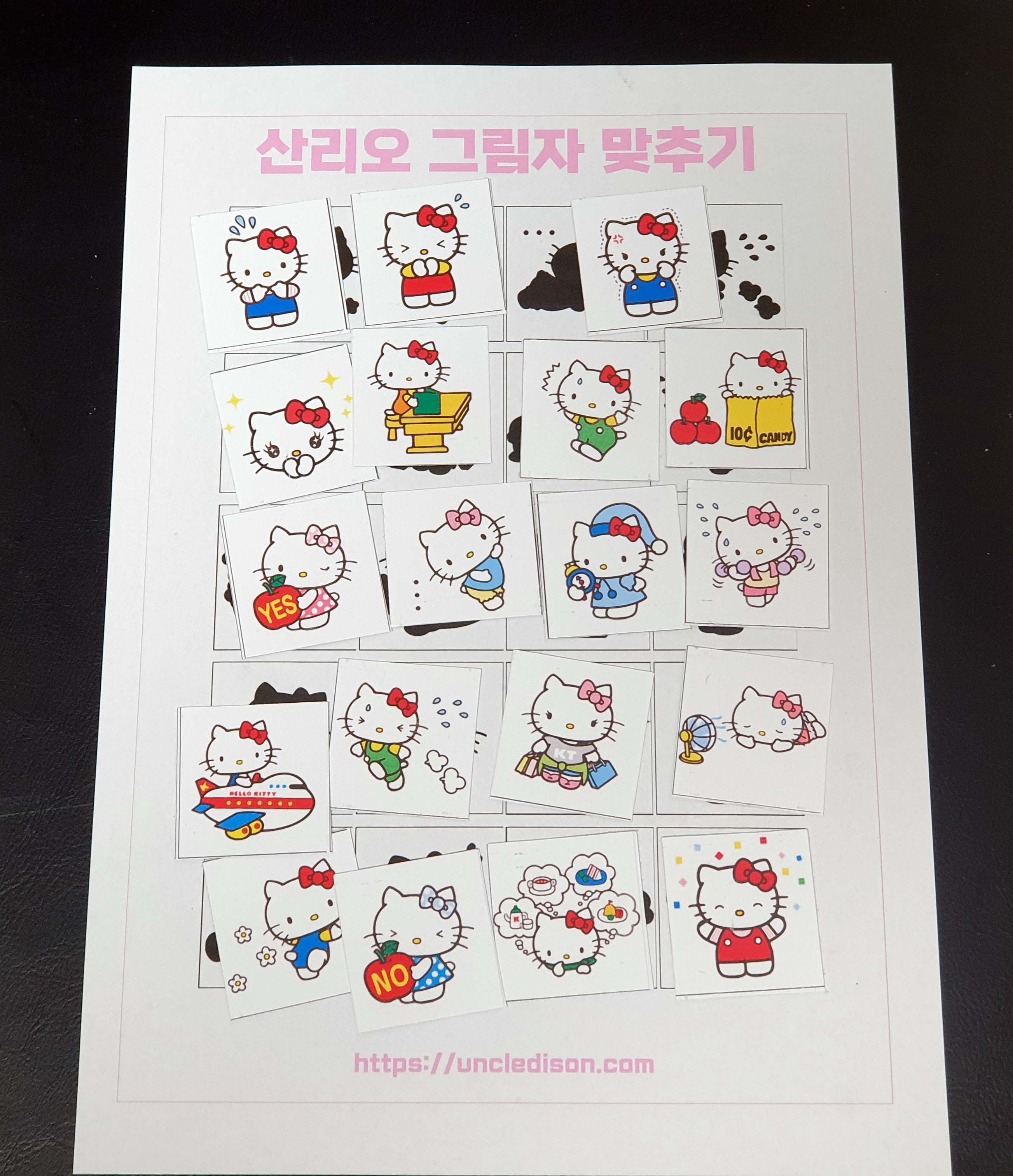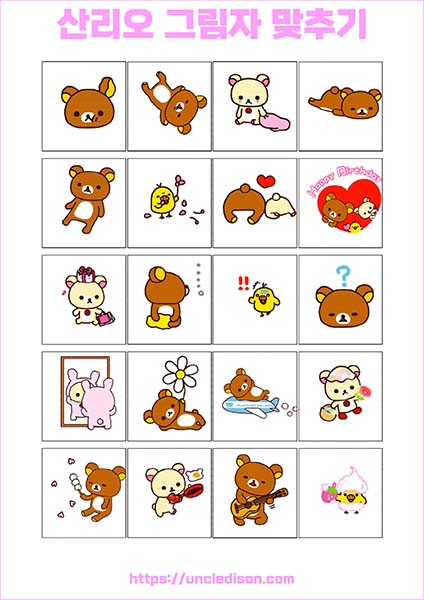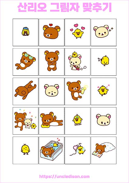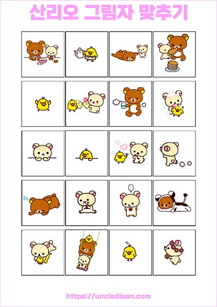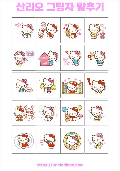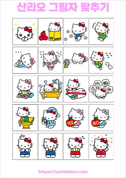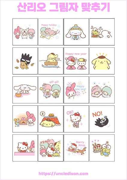 산리오 캐릭터 시나모롤 마이멜로디 쿠로미 케로피 헬로키티 폼폼푸린 리락쿠마 그림자 맞추기 퍼즐 게임 도안 놀이 프린트 무료다운 어르신 노인 유아 인지프로그램 치매예방