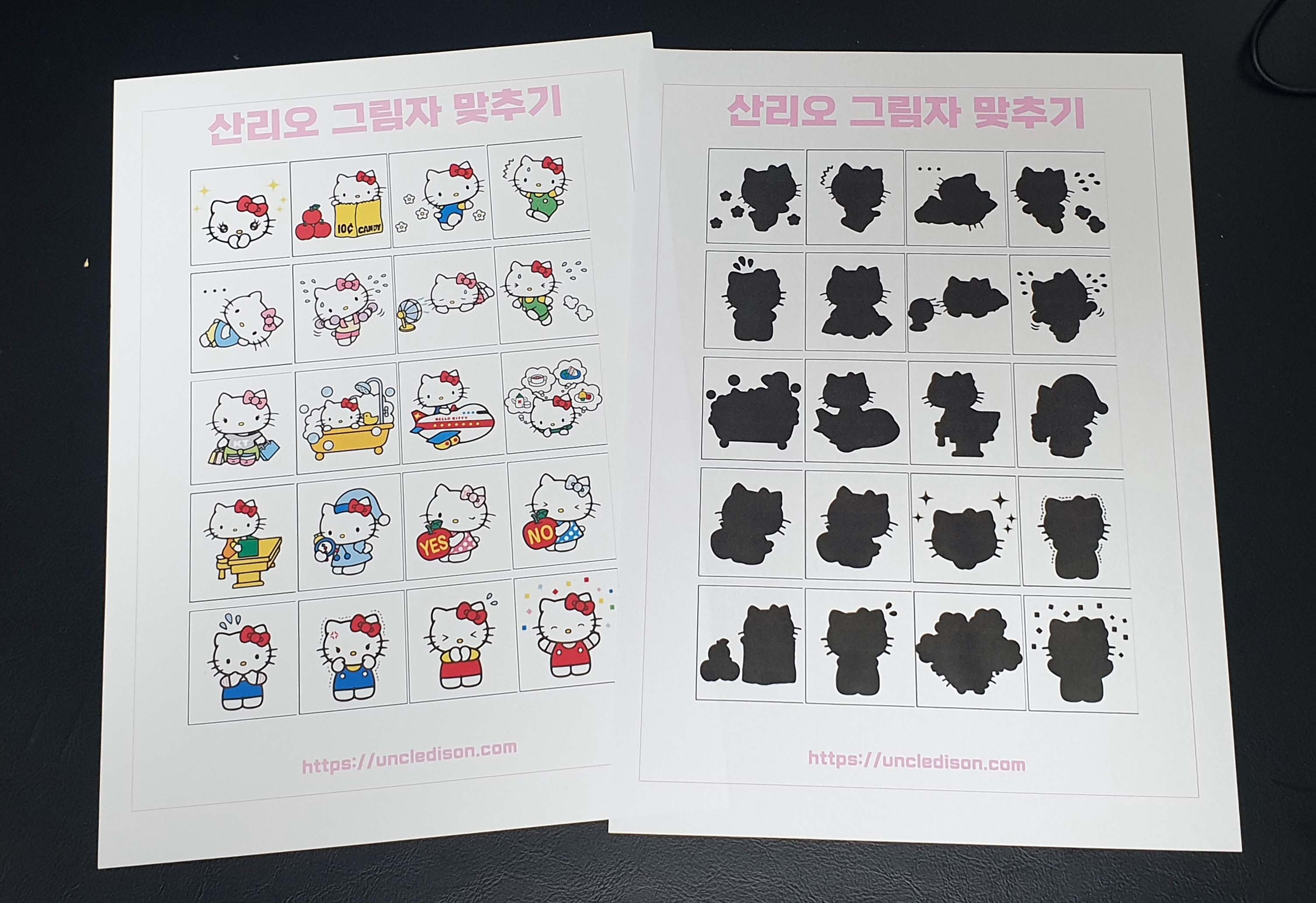 산리오 캐릭터인 사랑스러운 시나모롤, 헬로키티, 쿠로미, 마이멜로디, 폼폼푸린, 리틀트윈스타, 배드바츠마루, 리락쿠마 캐릭터들을 활용한 그림자 맞추기 도안을 제작했습니다.