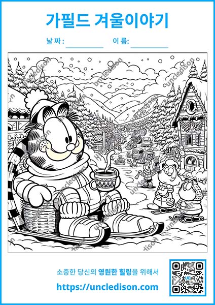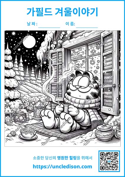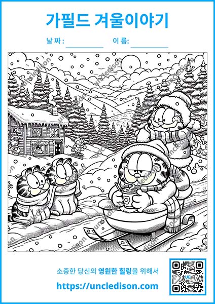 겨울은 가필드에게 특별한 계절입니다. 추운 날씨에도 불구하고 그의 게으름과 음식에 대한 사랑은 변함없이 빛나며, 이번 색칠도안은 그의 매력적인 성격을 십분 발휘하고 있습니다. 각 장면은 가필드의 개성 넘치는 모습을 통해 겨울의 즐거움을 그려냅니다. 게으르지만 순간순간 따뜻한 마음을 보여주는 가필드의 모습은 보는 이들에게 끊임없는 즐거움을 선사할 것입니다.