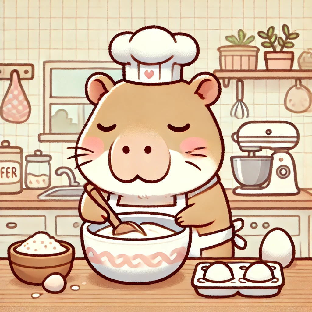 앞치마를 두르고 요리사 모자를 쓴 카피바라가 케이크 반죽을 만들고 있어요. 열심히 저으며 요리에 집중하는 모습이에요. - 피크닉을 즐기는 카피바라