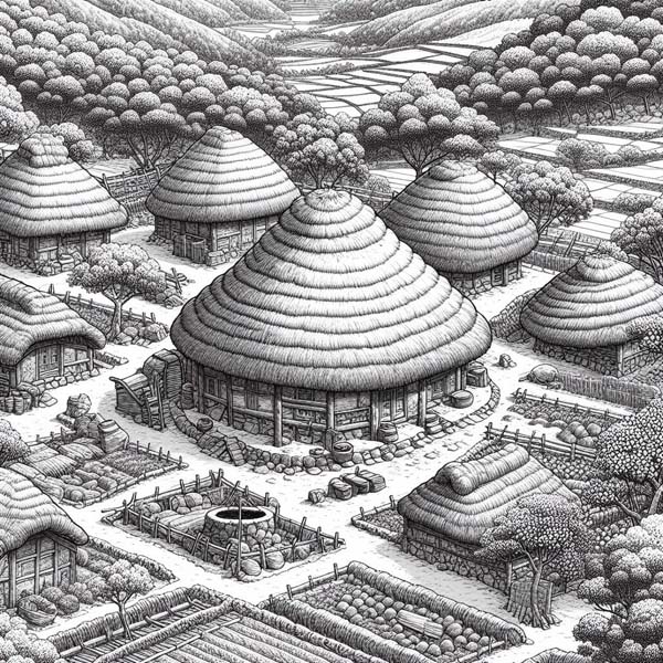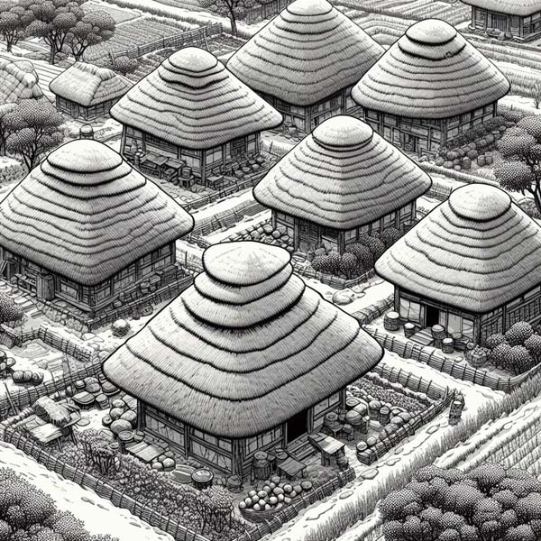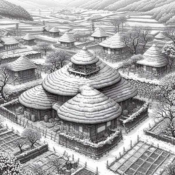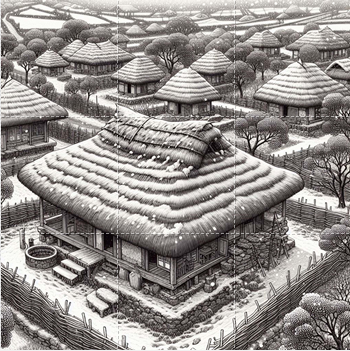 한국의 겨울풍경 한국의 겨울 시골 풍경을 담은 이 매력적인 색칠 페이지로 안녕하세요! 눈 덮인 풍경, 전통 한옥, 그리고 멀리 보이는 웅장한 산들의 평화로운 풍경에 발을 디딘 것처럼 느껴보