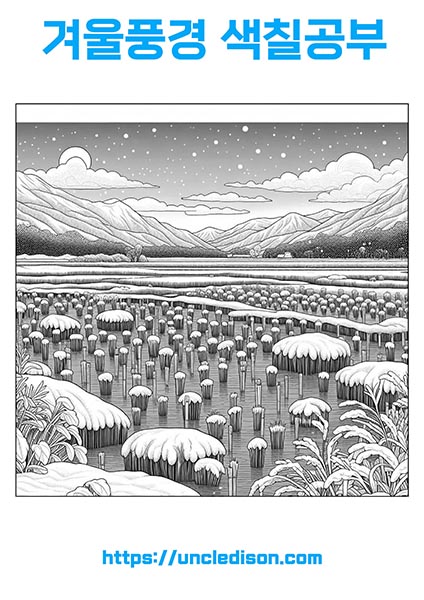 세 번째로, 겨울의 논은 한국 농촌에서 흔히 볼 수 있는 풍경입니다. 눈이 내리면서 얼어붙은 논 위에는 사람들이 걸어 다니며 논의 관리를 합니다. 이 도안에서는 얼어붙은 논과 논 위에서 일하는 농부들의 모습을 그려놓았으니 물감으로 색칠해보세요.