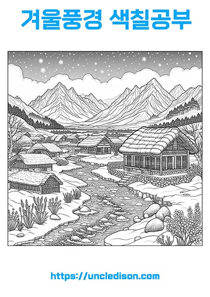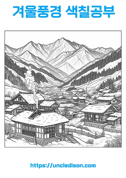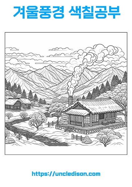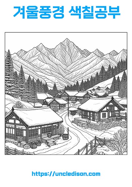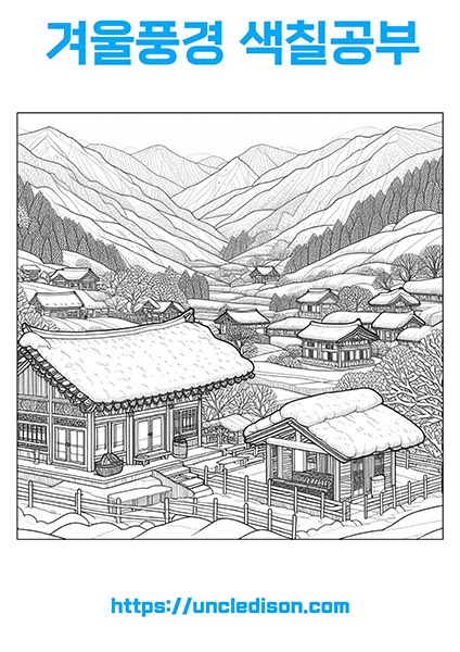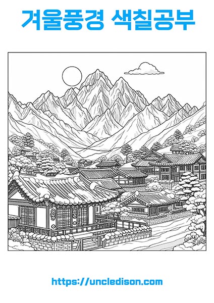 한국의 겨울풍경 한국의 겨울 시골 풍경을 담은 이 매력적인 색칠 페이지로 안녕하세요! 눈 덮인 풍경, 전통 한옥, 그리고 멀리 보이는 웅장한 산들의 평화로운 풍경에 발을 디딘 것처럼 느껴보