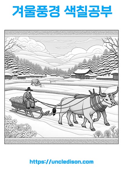 한국의 겨울 시골은 아름다운 풍경과 특별한 경험을 선사하는 곳입니다. 눈이 내리면서 시골의 기와집과 초가집은 우리에게 따뜻한 아늑함과 평화로움을 떠올리게 합니다. 이번에는 눈덮힌 시골의 기와집과 초가집, 그리고 겨울파종, 겨울의 논, 겨울철 농사일, 시골장터를 주제로 한 색칠도안을 제작했습니다.