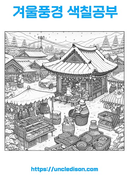 마지막으로, 시골장터는 한국 시골에서 자주 볼 수 있는 장면 중 하나입니다. 겨울에도 시골장터에서는 신선한 농산물과 다양한 상품들이 진열되어 시골 사람들의 생활에 활력을 더해줍니다. 이 도안에서는 시골장터의 분위기와 다양한 상품들을 그려놓았으니 색감으로 화려하게 표현해보세요.