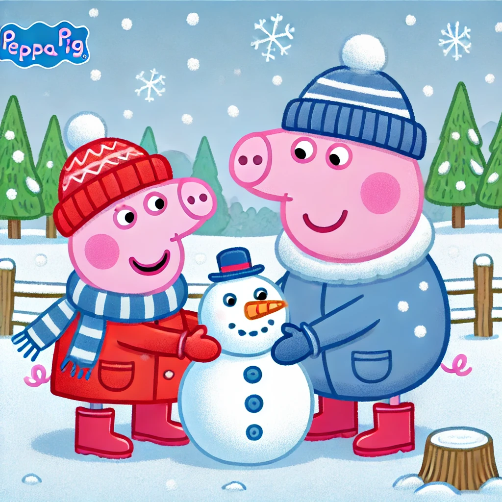 첫 번째 장면에서는 페파와 조지가 함께 커다란 눈덩이를 데굴데굴 굴리며 신나게 눈사람을 만들 준비를 하고 있어요. 두 남매의 설레는 표정이 얼마나 사랑스러운지 몰라요! ⛄