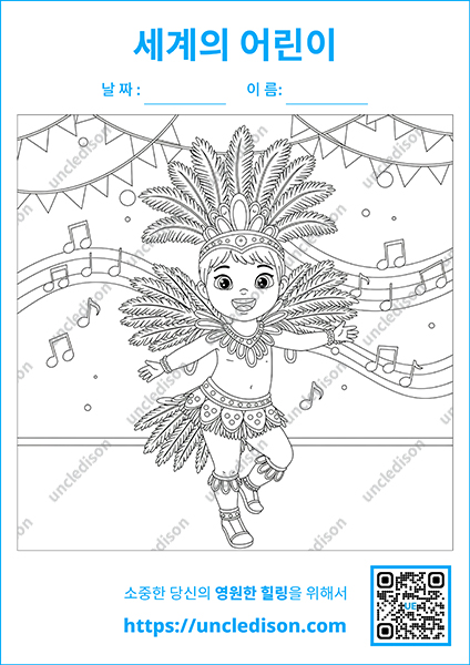 10. 브라질 – 삼바 축제 복장의 아이 색칠도안