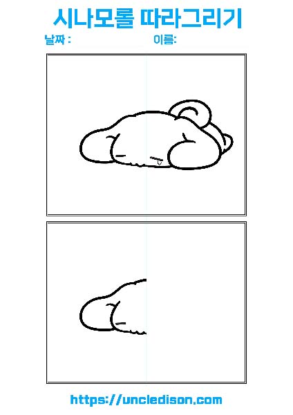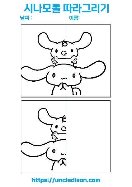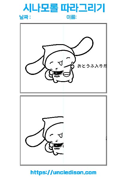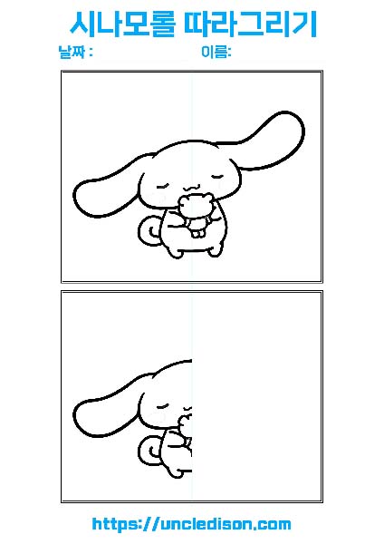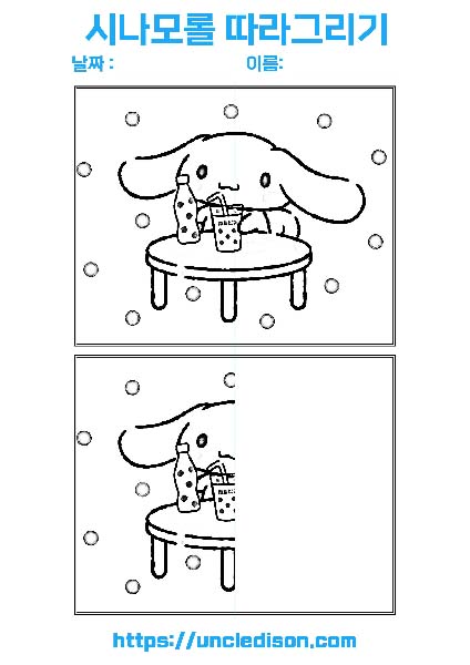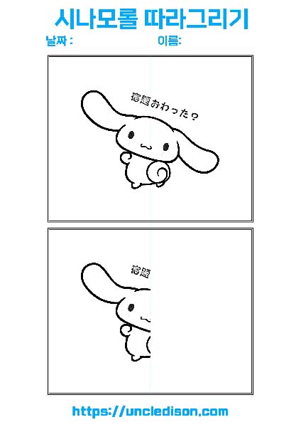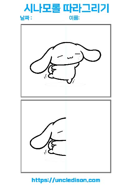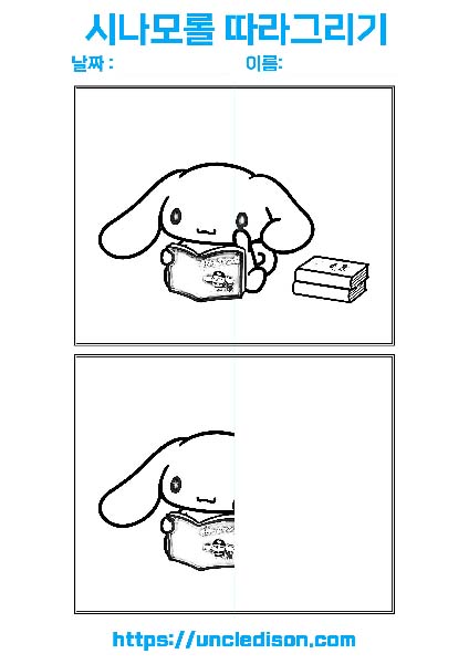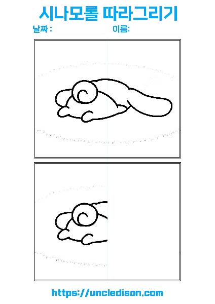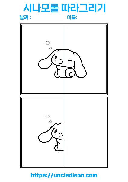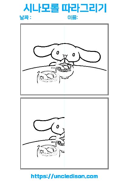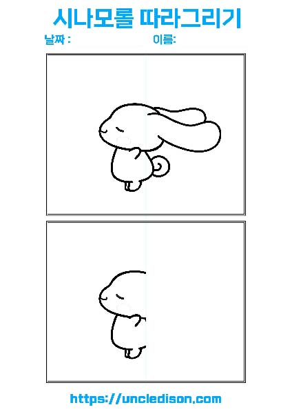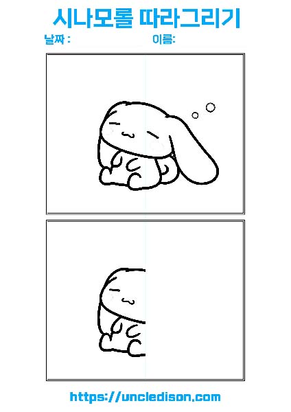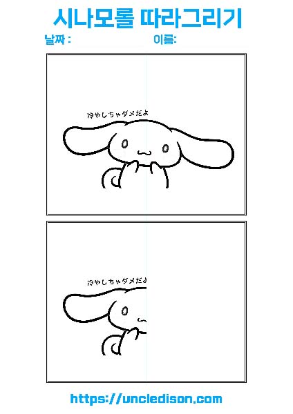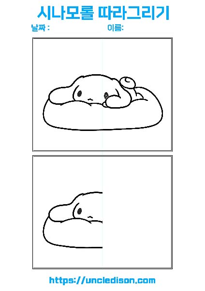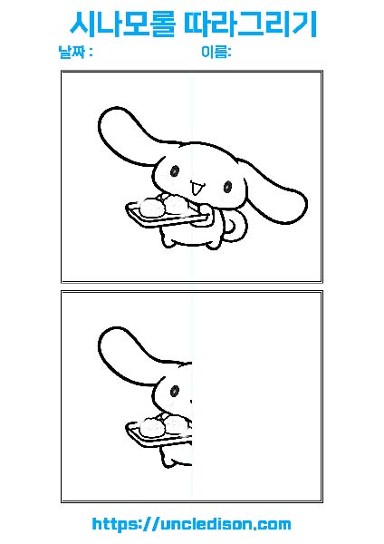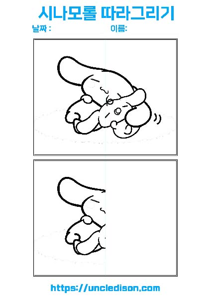 시나모롤 따라그리기 도안에는 귀엽고 심플한시나모롤의 이미지가 포함되어 있습니다. 총 68장의 도안이 업로드되어 있어, 유아나 어르신들도 쉽게 따라그리고 색칠까지 하실 수 있습니다. 시나모롤 색칠공부도안