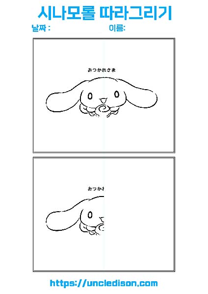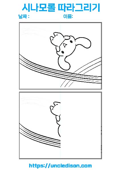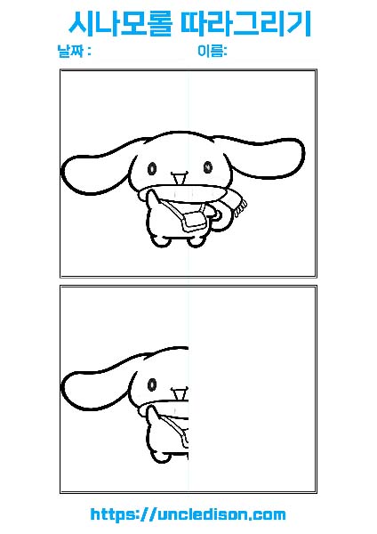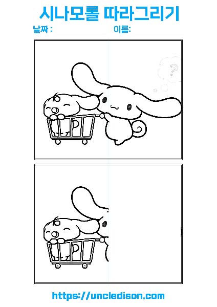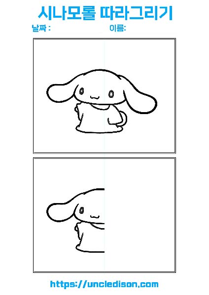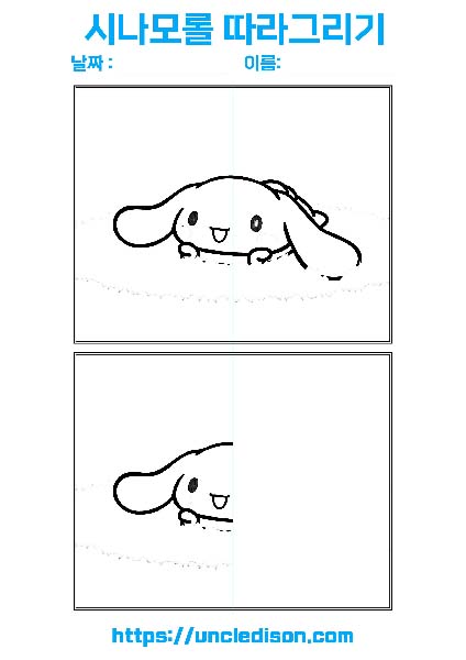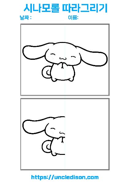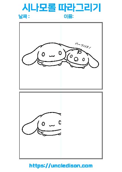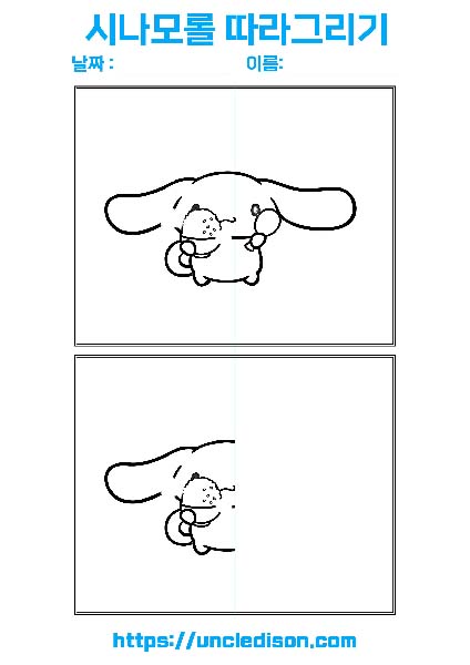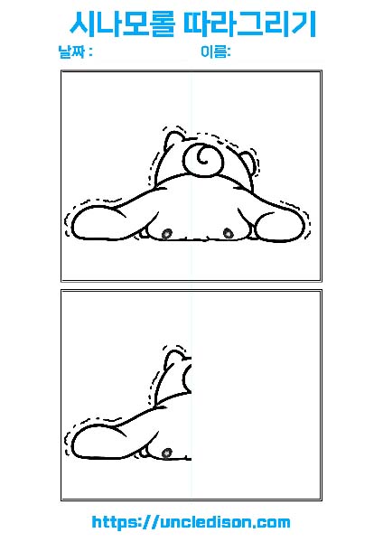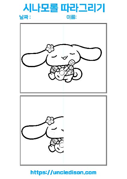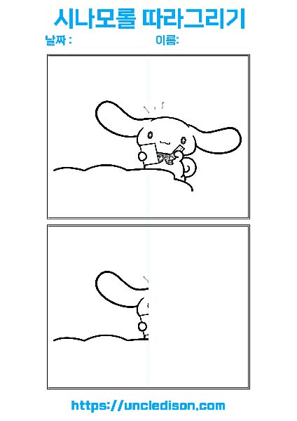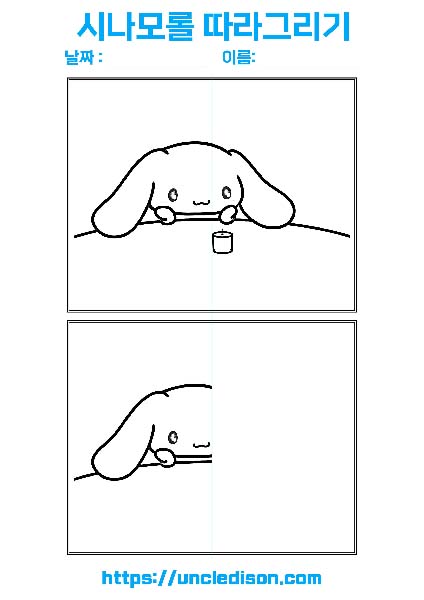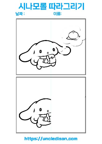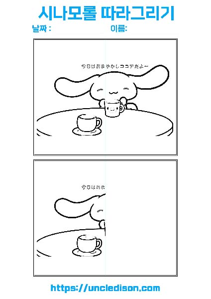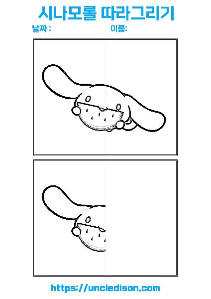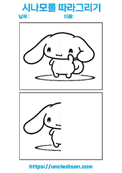 시나모롤 따라그리기 도안에는 귀엽고 심플한시나모롤의 이미지가 포함되어 있습니다. 총 68장의 도안이 업로드되어 있어, 유아나 어르신들도 쉽게 따라그리고 색칠까지 하실 수 있습니다. 시나모롤 색칠공부도안