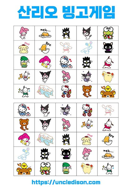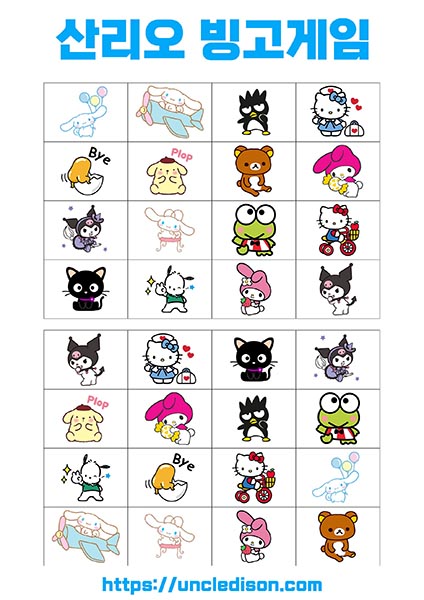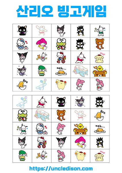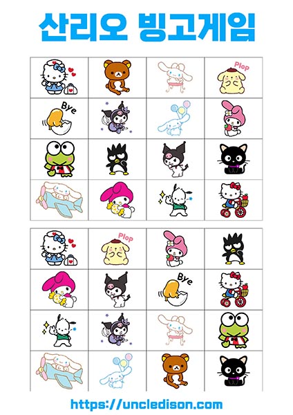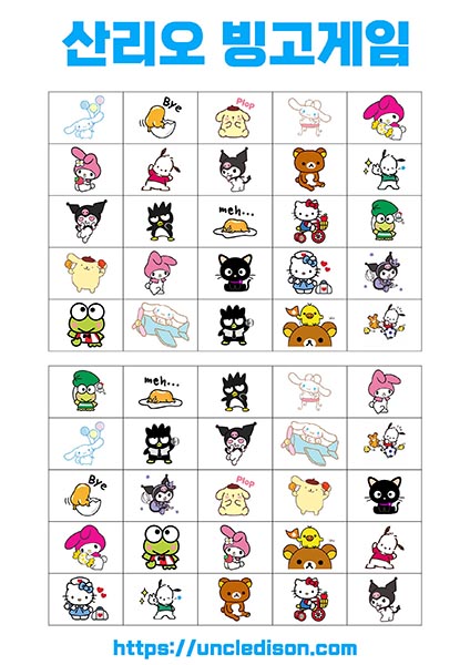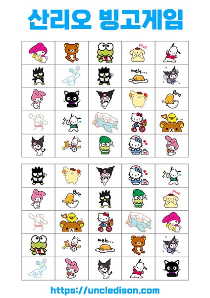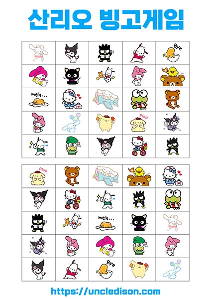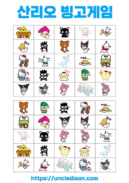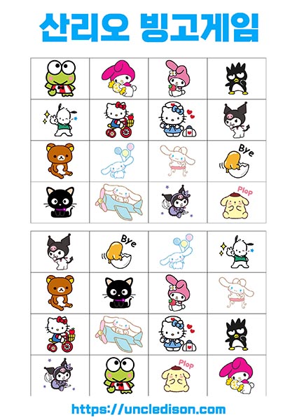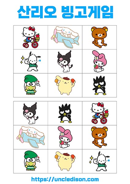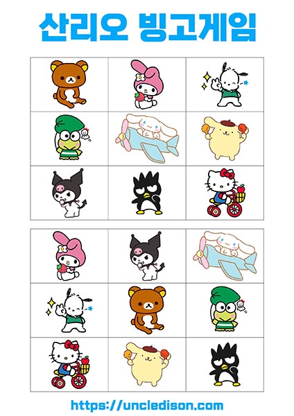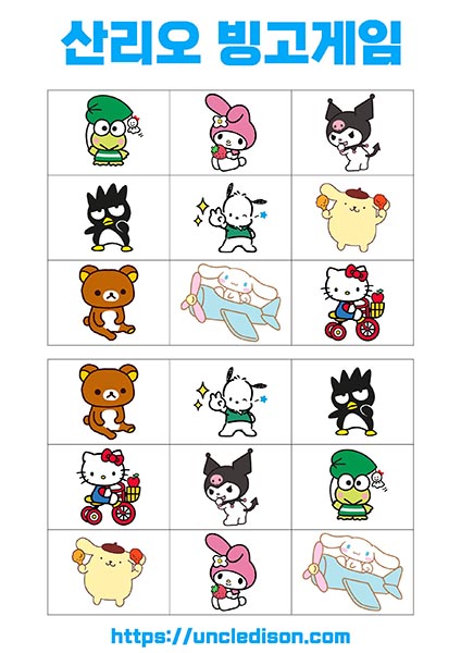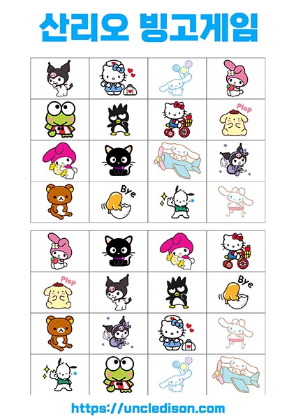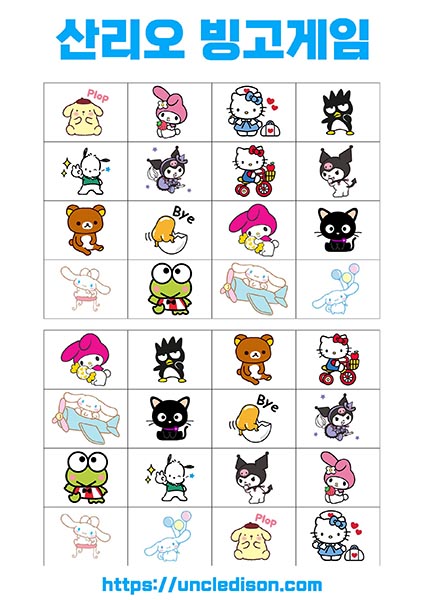 - 시나모롤, 마이멜로디, 리락쿠마 등: 각 캐릭터는 사랑스럽고 독특한 디자인으로 빙고판을 더욱 풍부하게 만듭니다. 어린이들에게는 익숙한 친근한 캐릭터들로 재미있는 경험을 선사합니다.