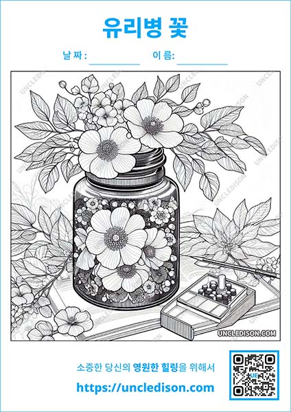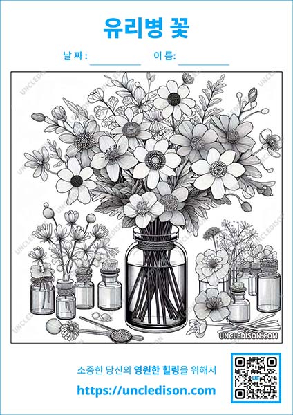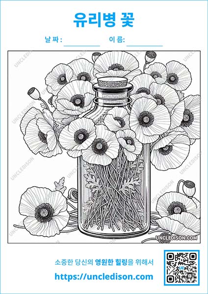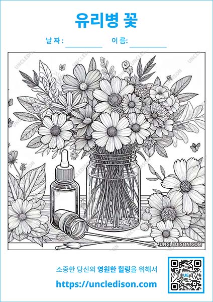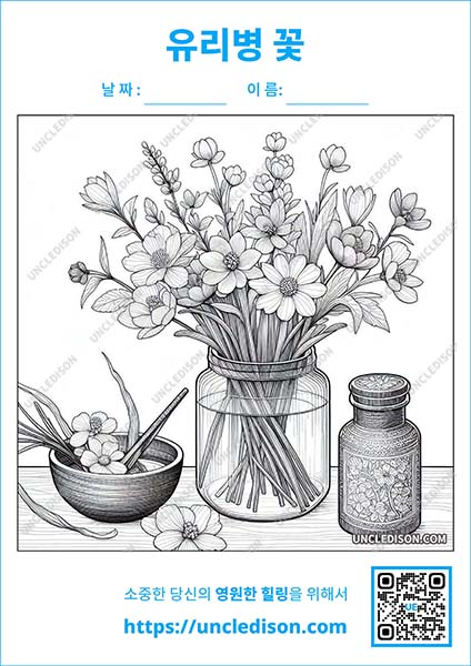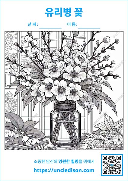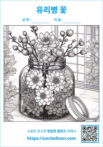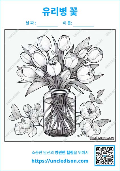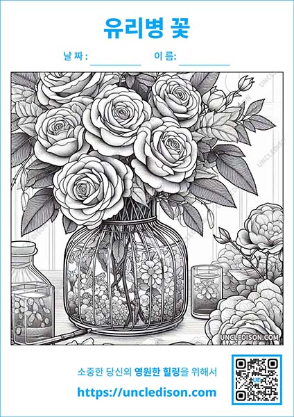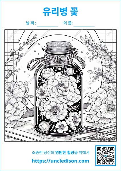 유리병에 담긴 꽃투명 유리병에 담긴 아름다운 꽃 색칠 도안을 만들어 보았습니다. 이 도안들은 다양한 색깔과 형태의 꽃들이 투명한 유리병 속에서 마치 요정의 정원처럼 아름답게 빛나는 모
