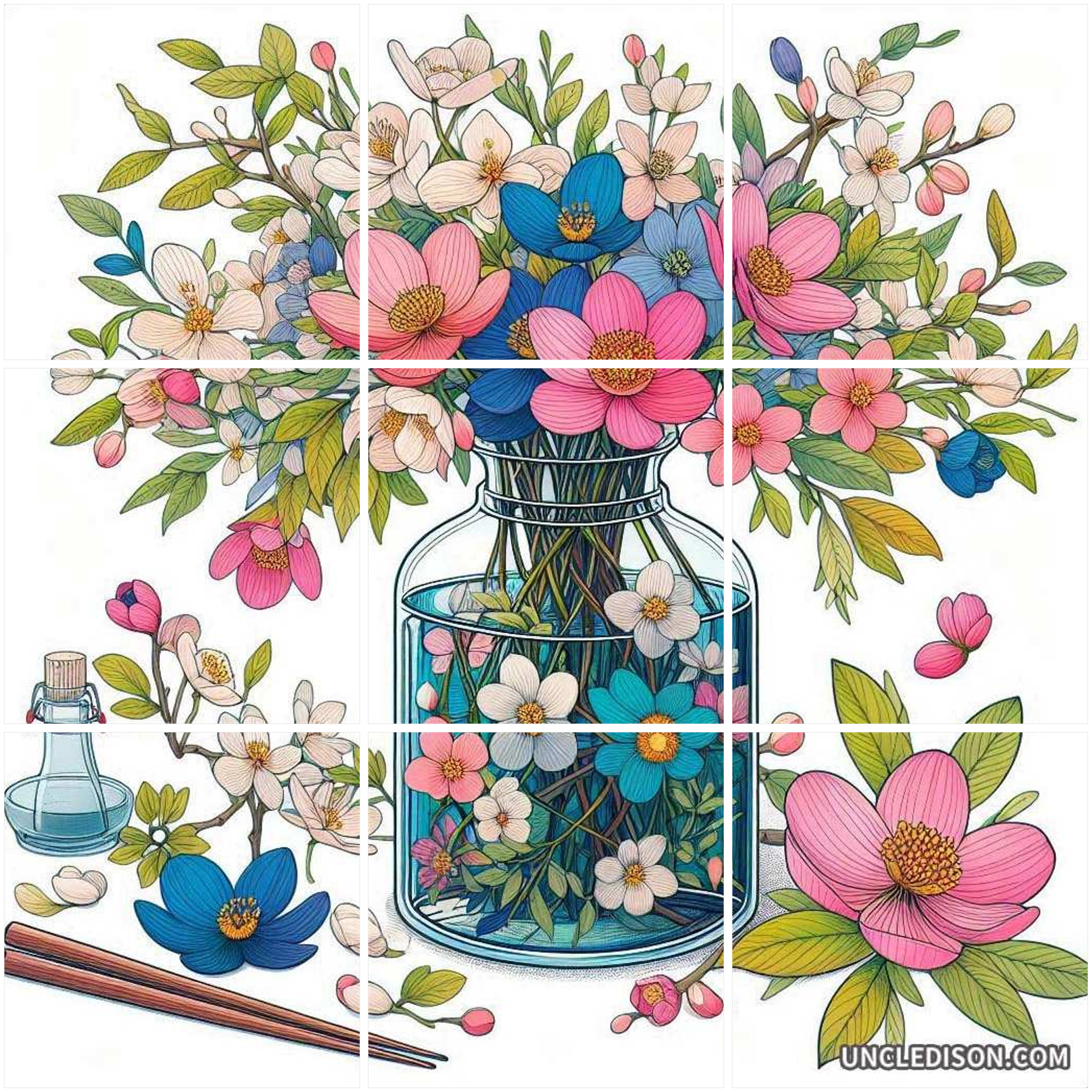 오늘은 여러분께 아주 특별한 선물을 준비했습니다. 바로 유리병 속에 담긴 아름다운 꽃 도안을 3x3 협동화로 제작한 것입니다. 이 도안들은 다양한 색깔과 형태의 꽃들이 투명한 유리병 속에서 마치 요정의 정원처럼 아름답게 빛나는 모습을 담고 있습니다. 각 도안은 조화롭게 배치되어 하나의 큰 그림을 완성할 수 있도록 구성되었습니다.
