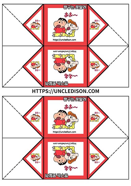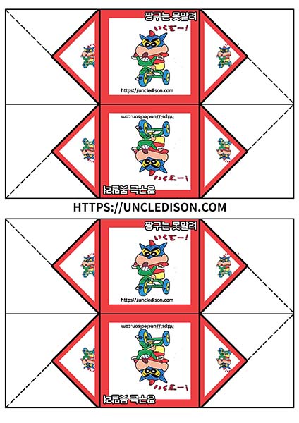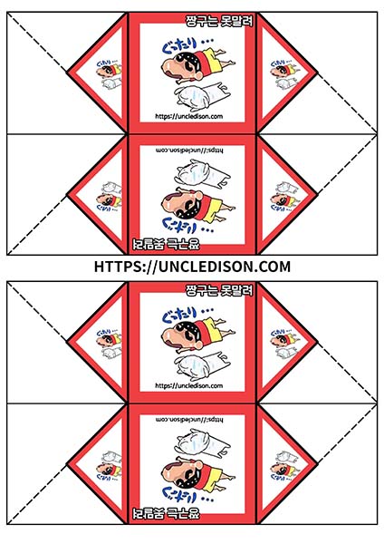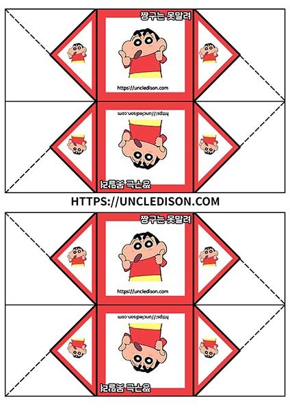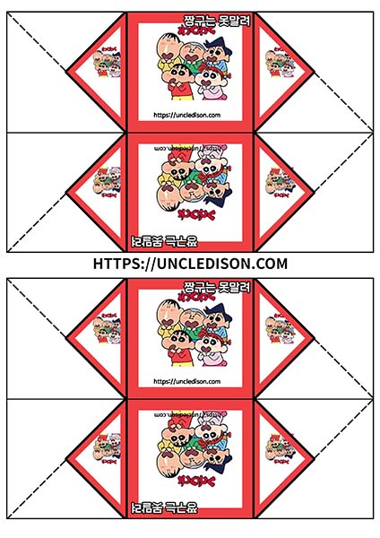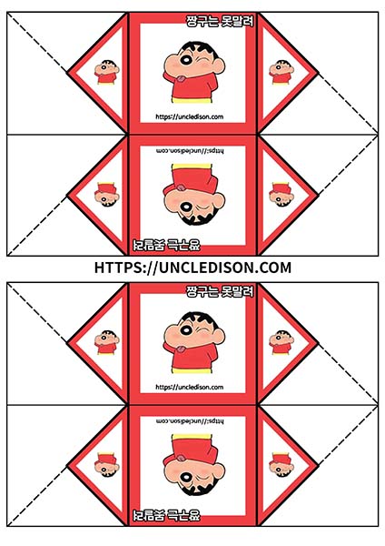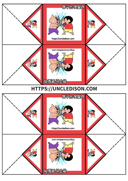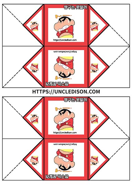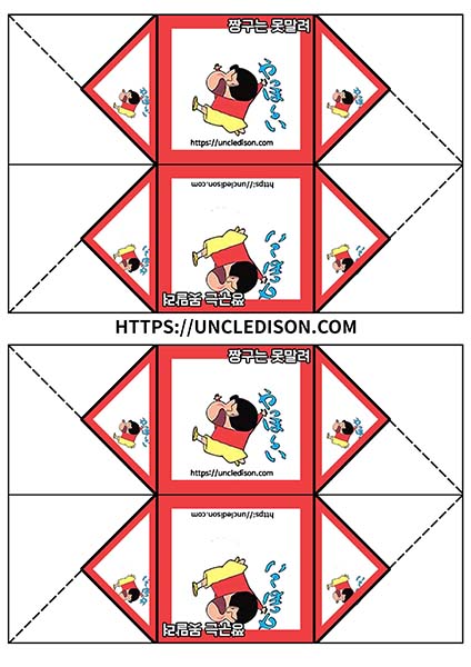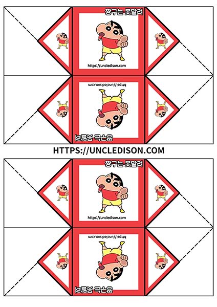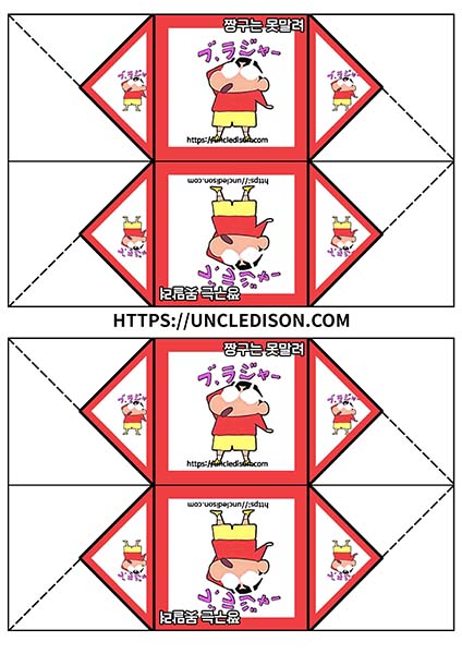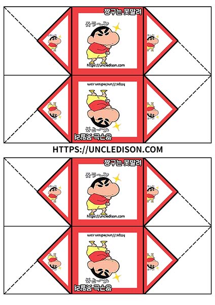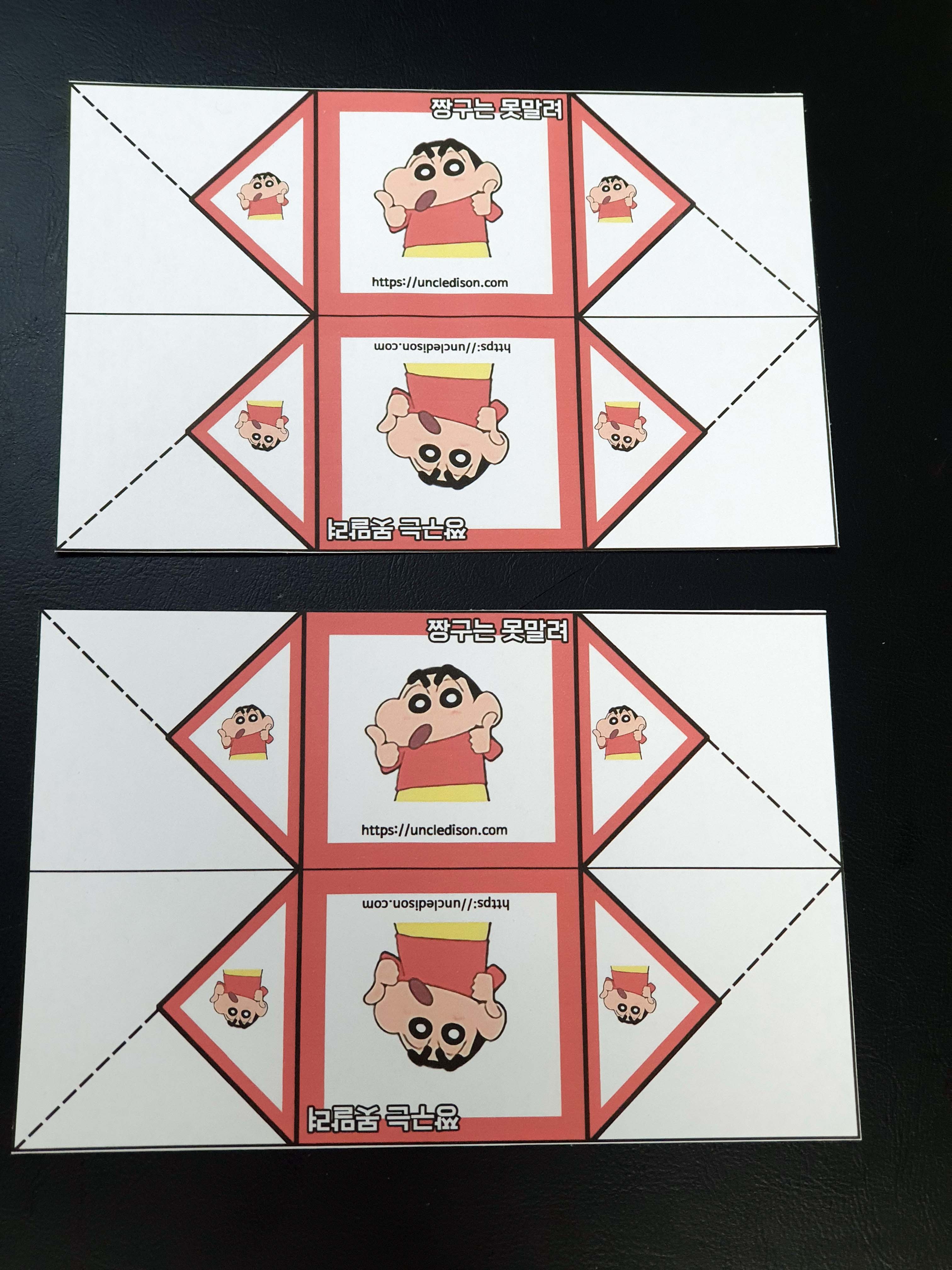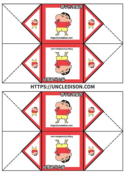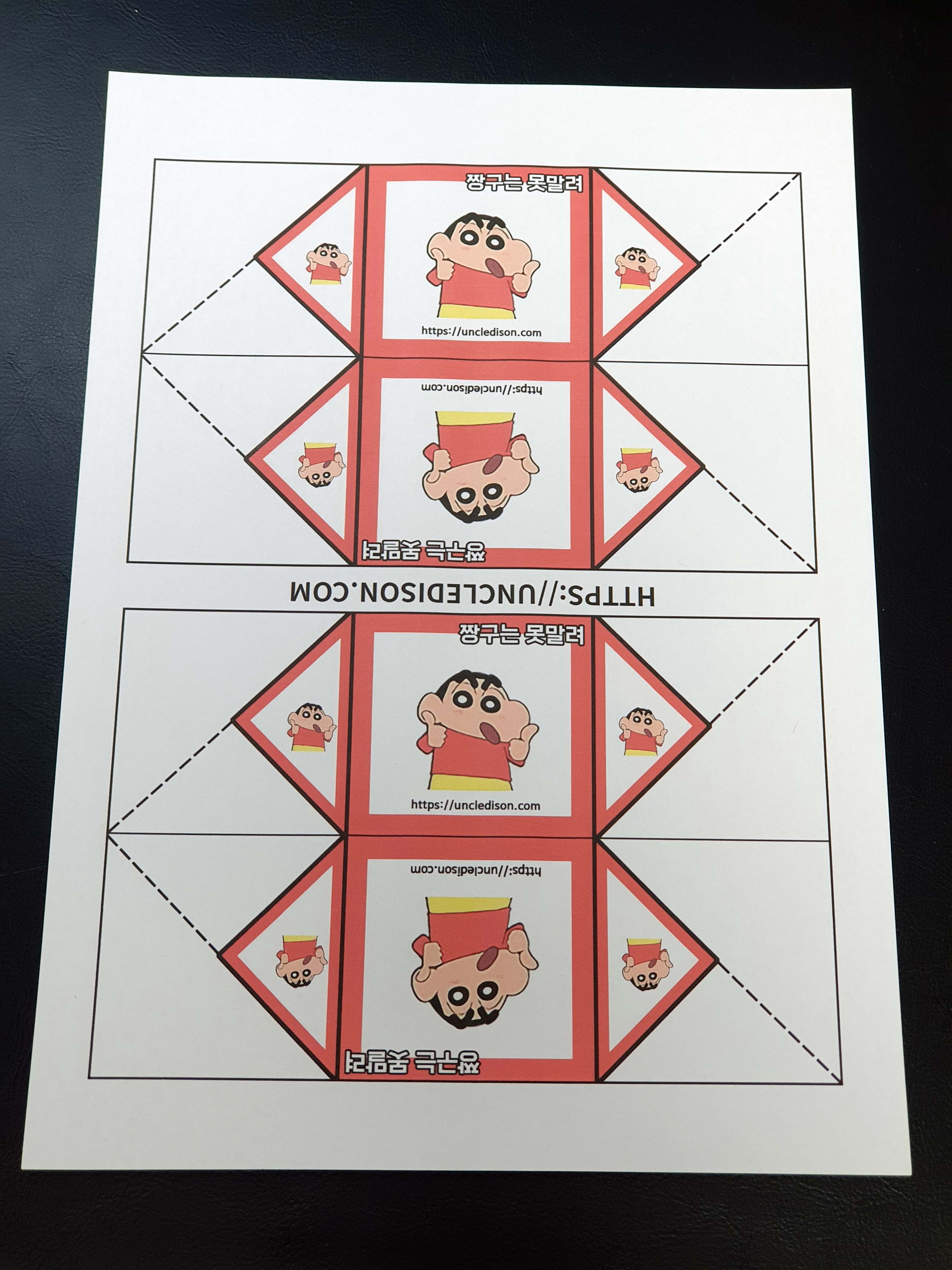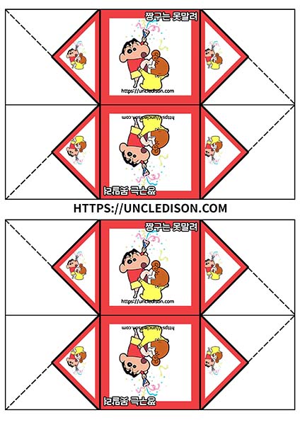 귀여운 짱구 캐릭터로 딱지를 만들어 보았습니다. A4용지 1장을 프린트를 하면 1장의 딱지가 완성됩니다.