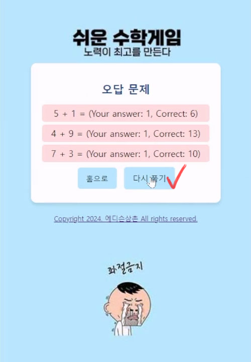그리고 수학게임을 다하고 나서 아래의 마침버튼을 누르게 되면